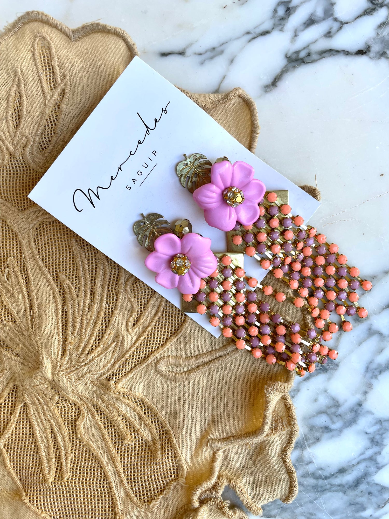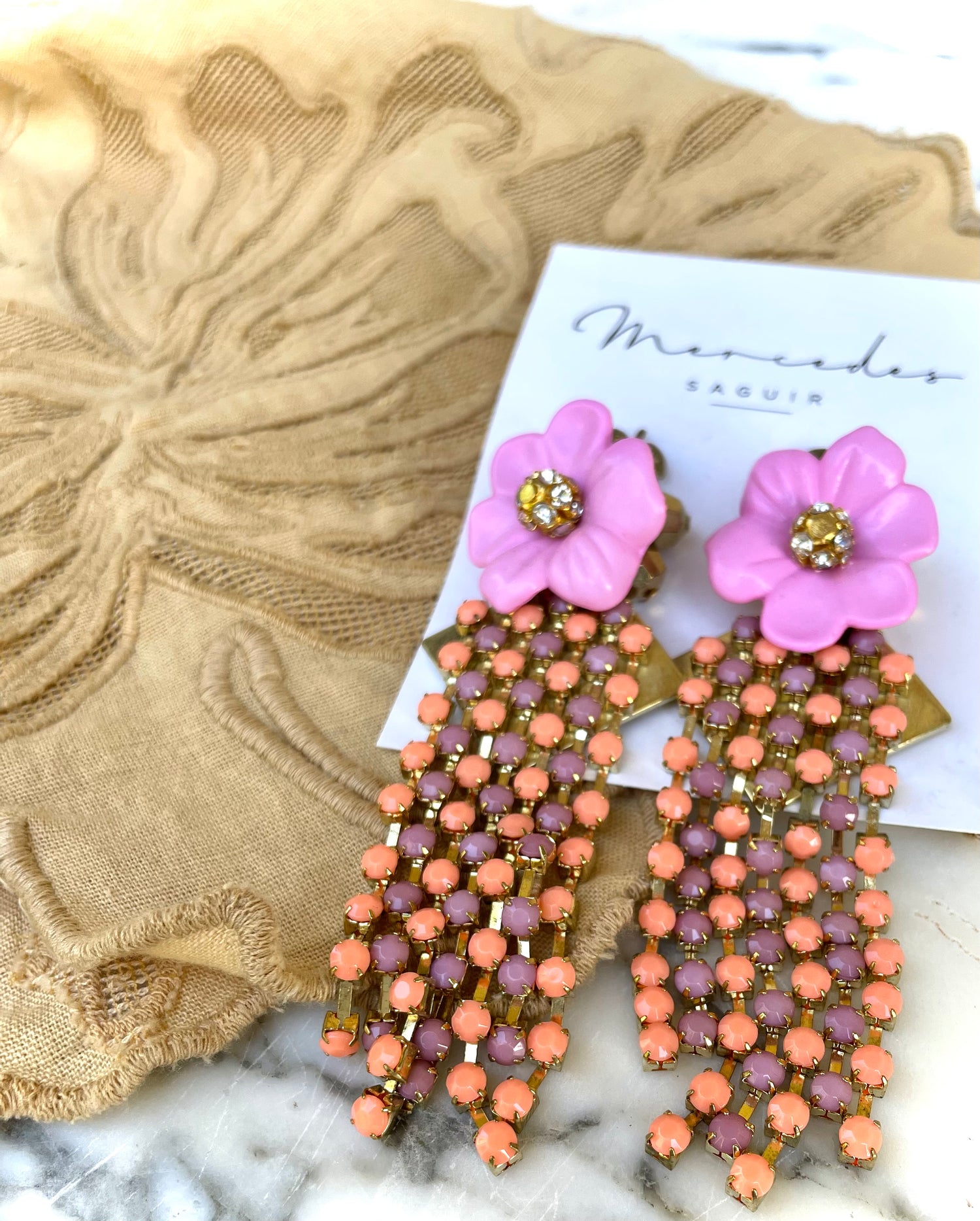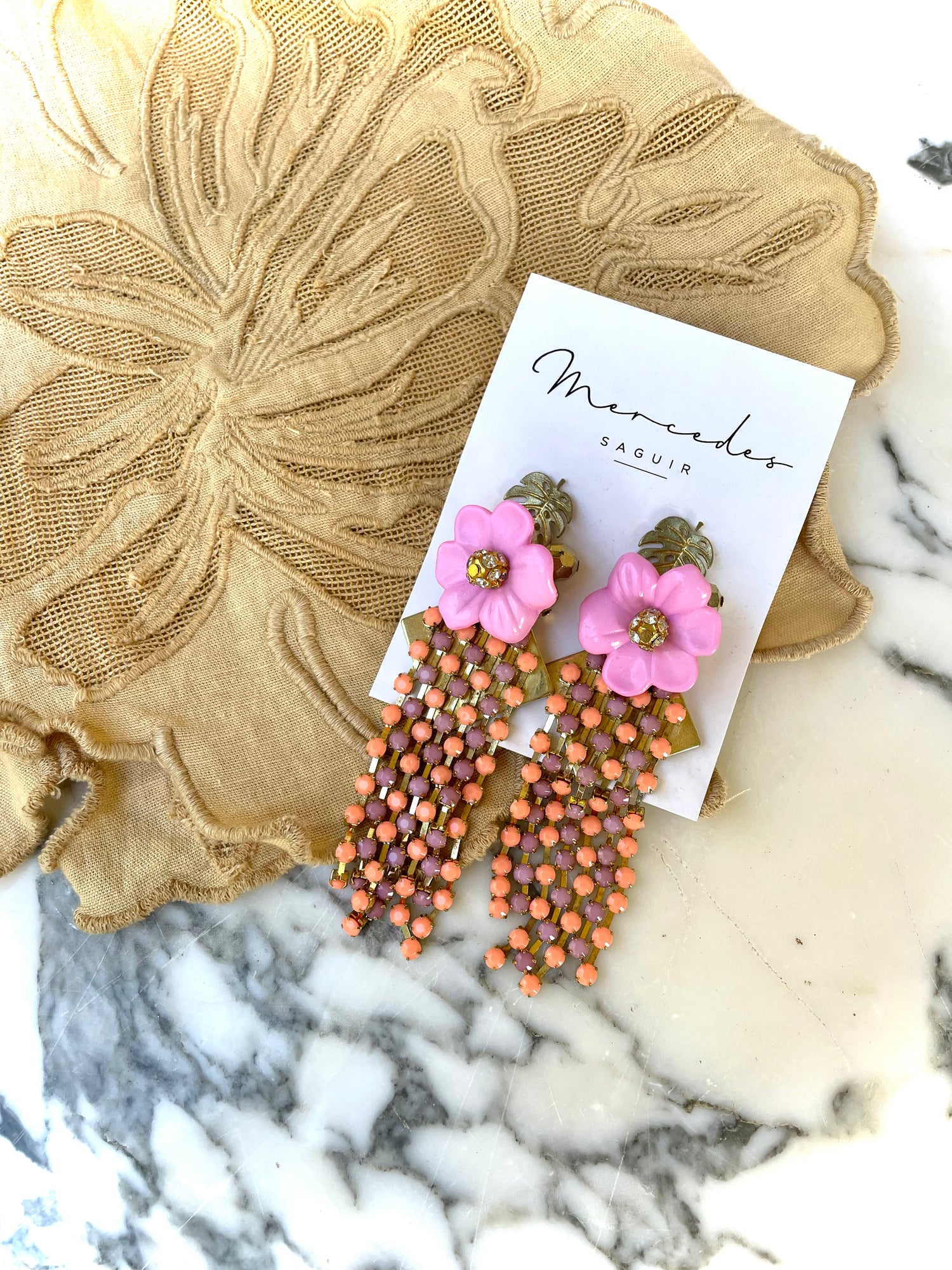 Aros Margot un diseño realizado sobre una base de latón enchapado en oro 14k , donde se despliegan tiras de strass de color coral y un rosa pálido.