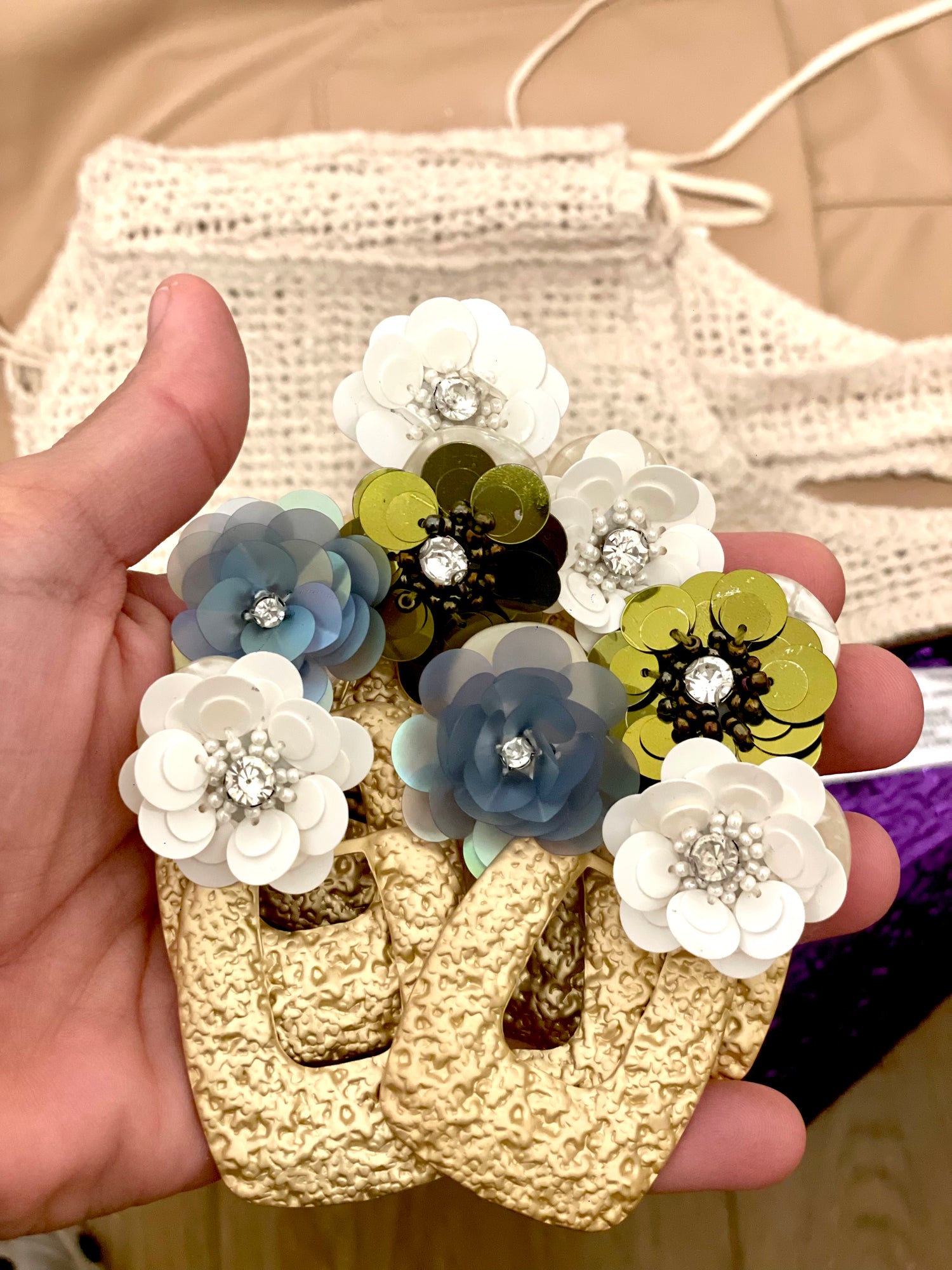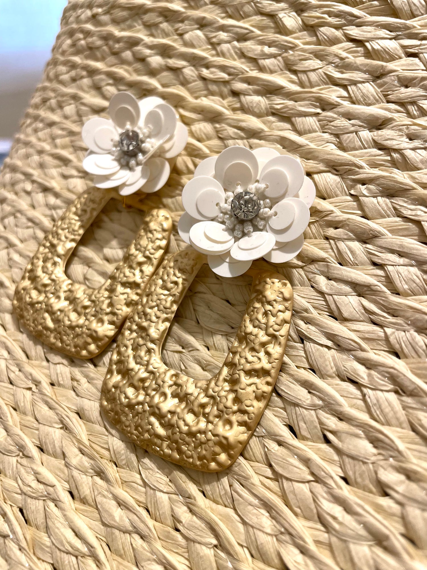 Pendientes BELA, nuestros pendientes están diseñados y armados con una pieza de latón con baño 10 k, con una flor de lentejuelas