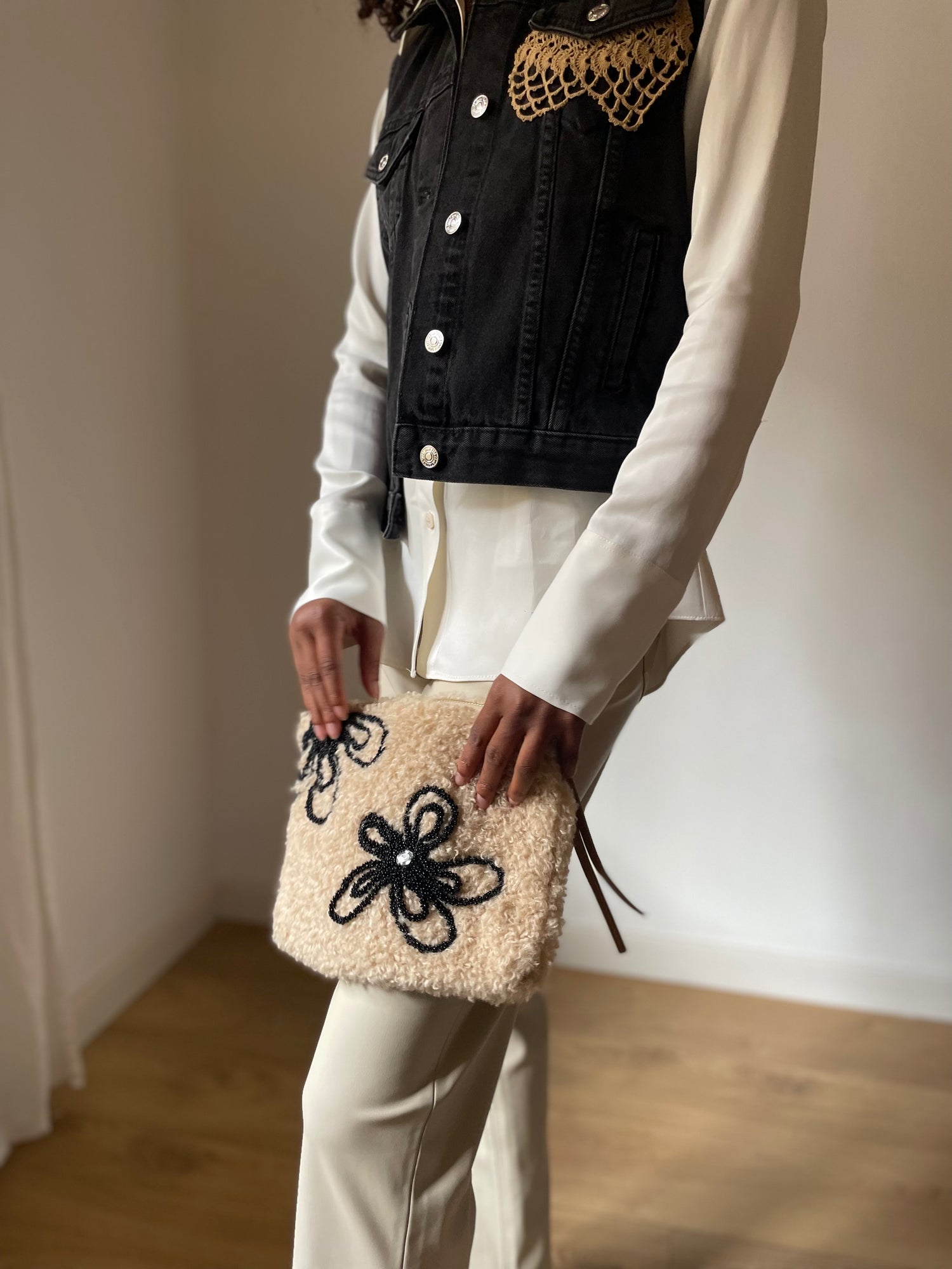 Bolso de tela borreguito con flores aplicadas en cordón de mostacillas negro