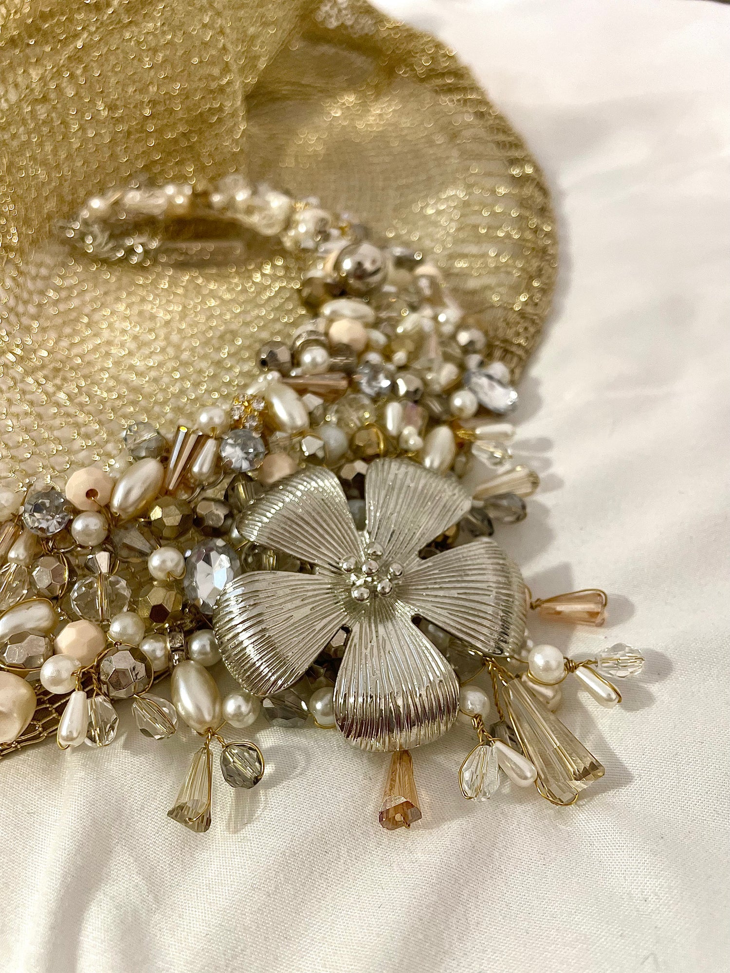 - Este modelo está armado con cristales color nude, piedras , perlas blancas y naturales strass y acrílicos en tonos dorado y algo de rosa