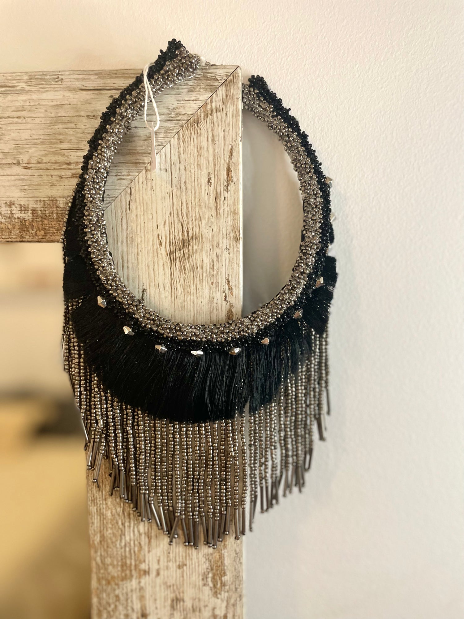 - Armado con doble cordón de mostacillas, un galón de flecos de seda antiguos y una lluvia de mostacillas en color plata.