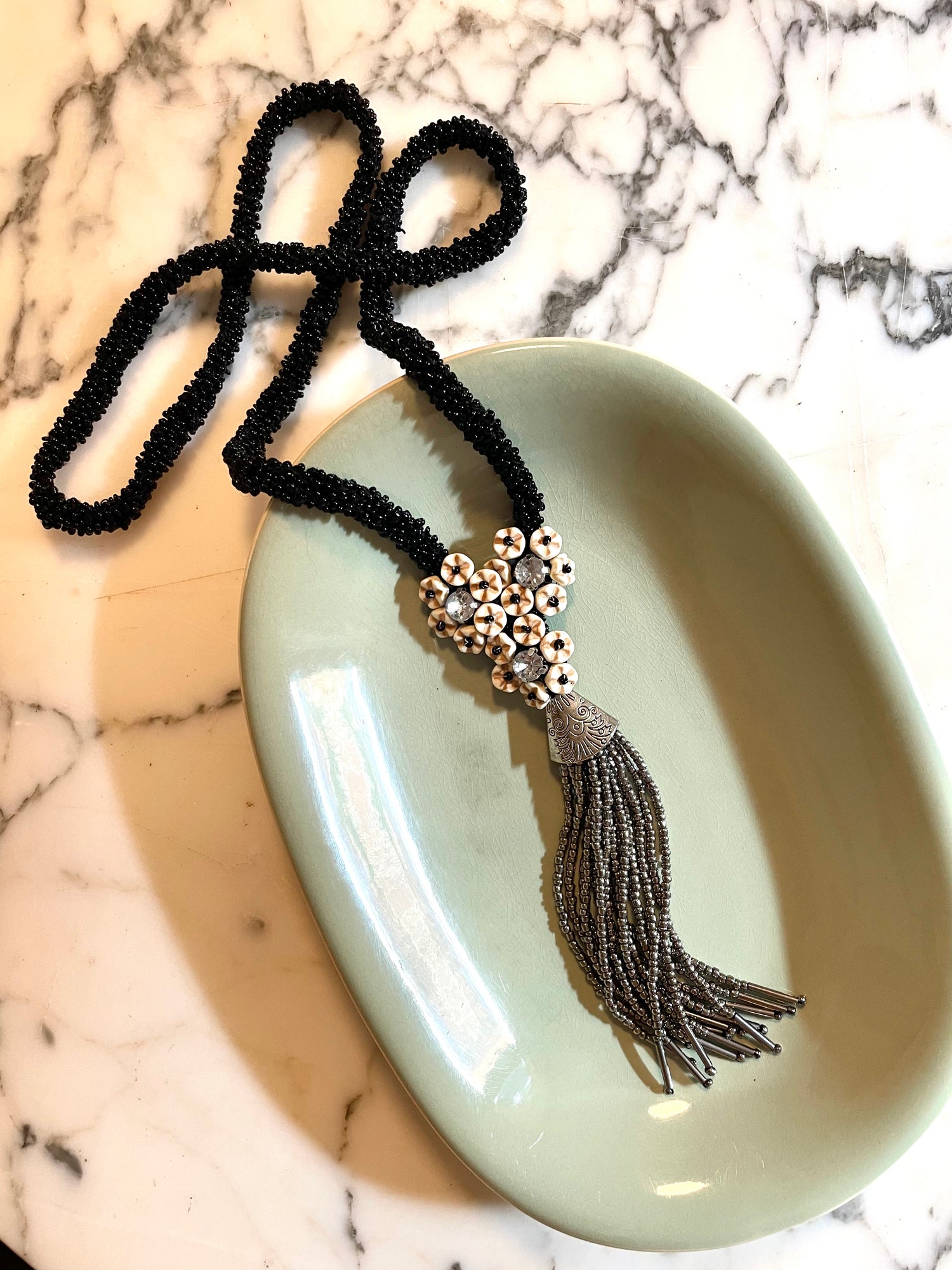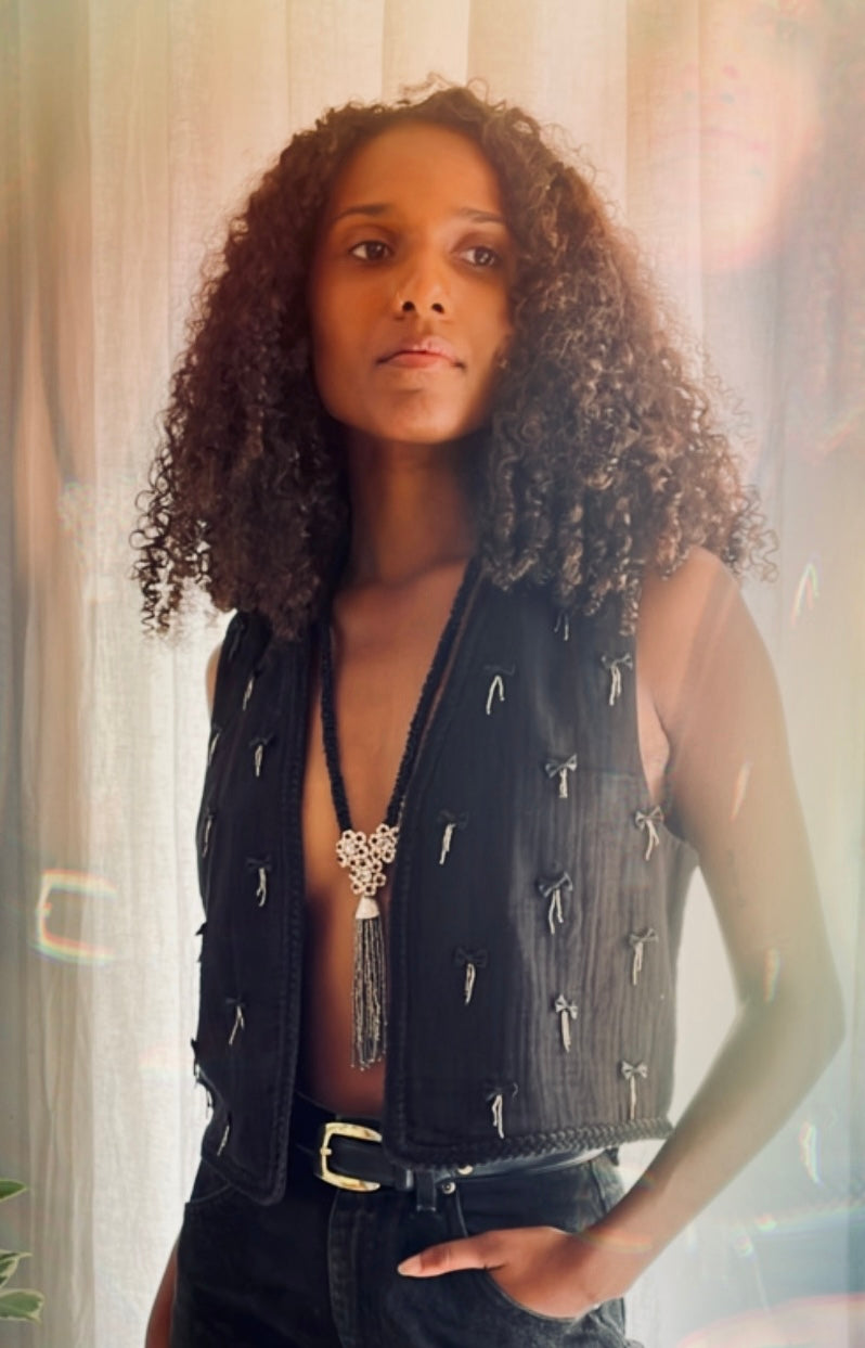 Nuestro collar VILA esta armado en cordón bordado de mostacillas negro.