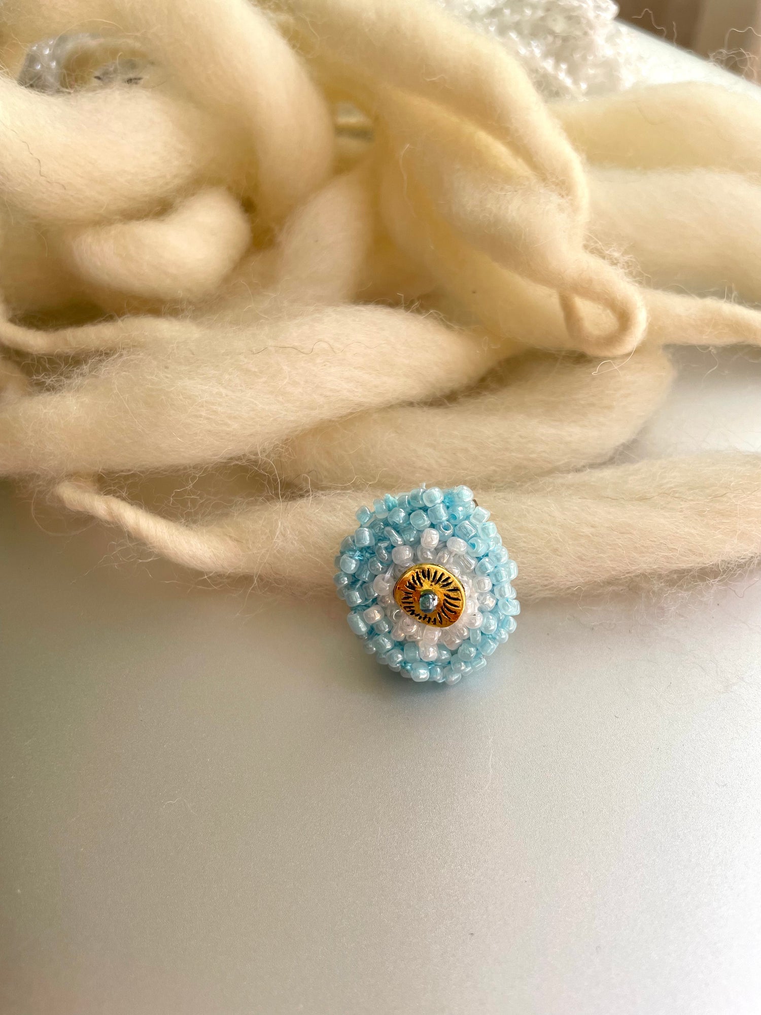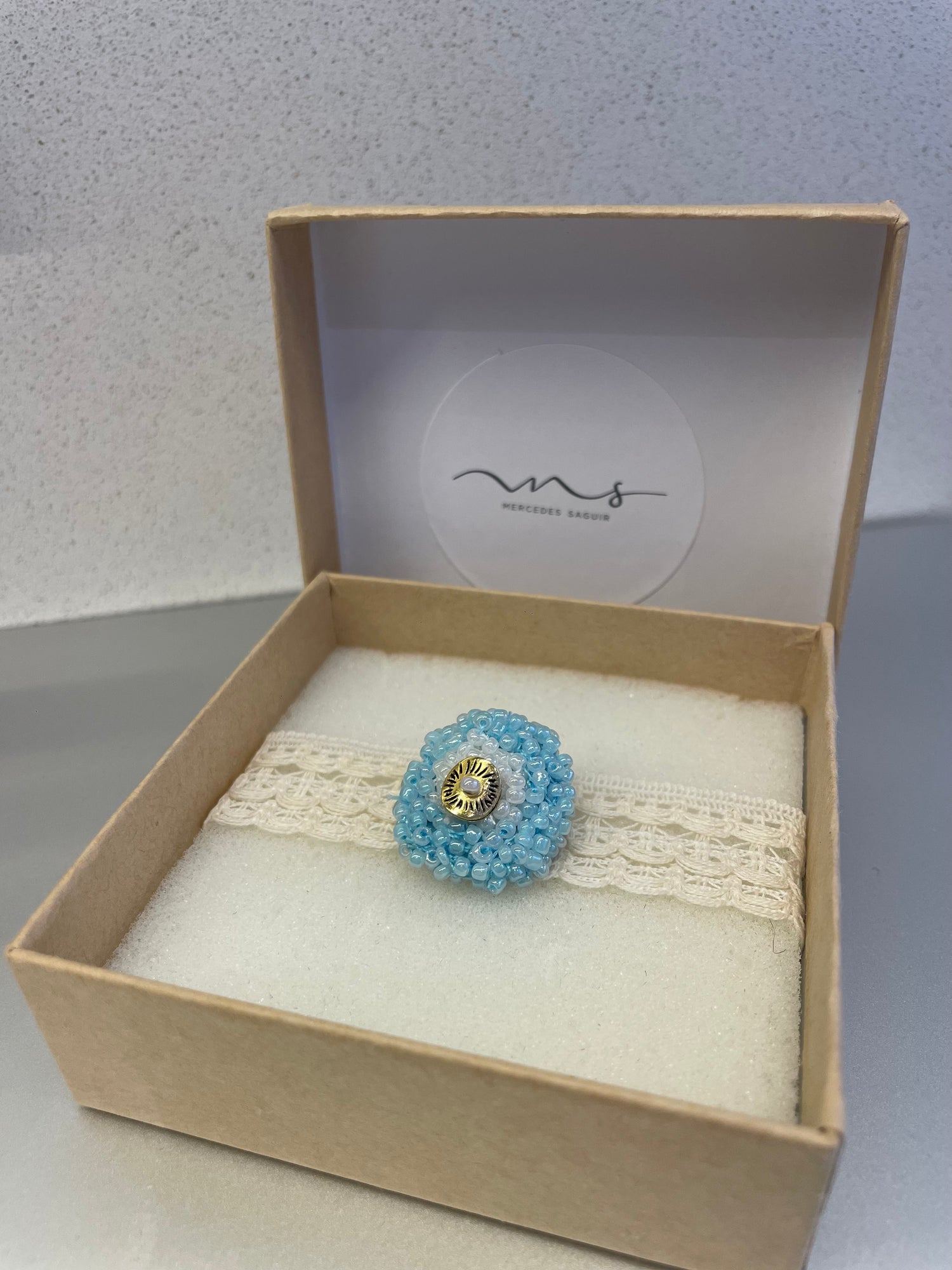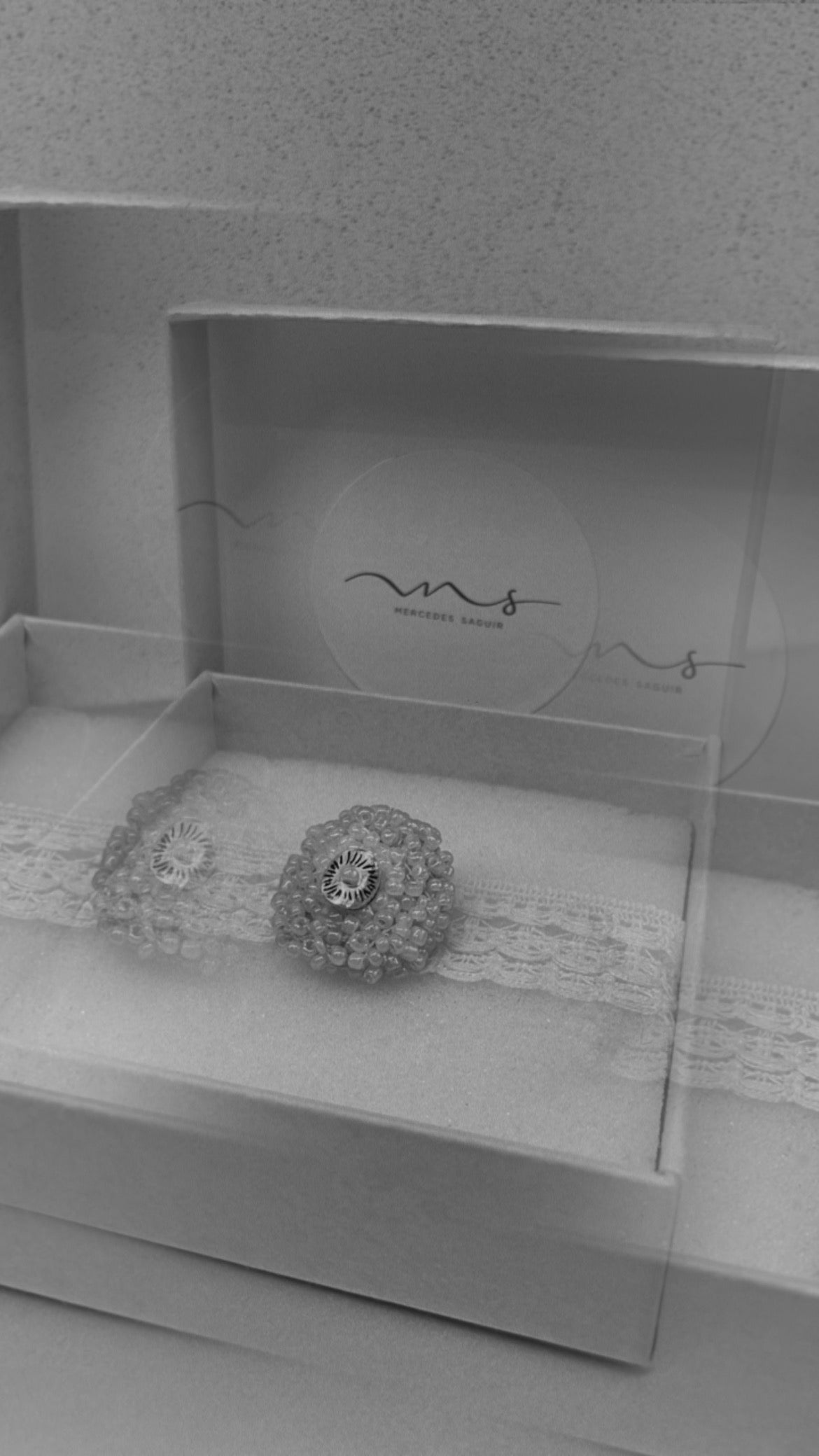 - Armada con cordones de mostacillas en tonos blanco y celeste.
