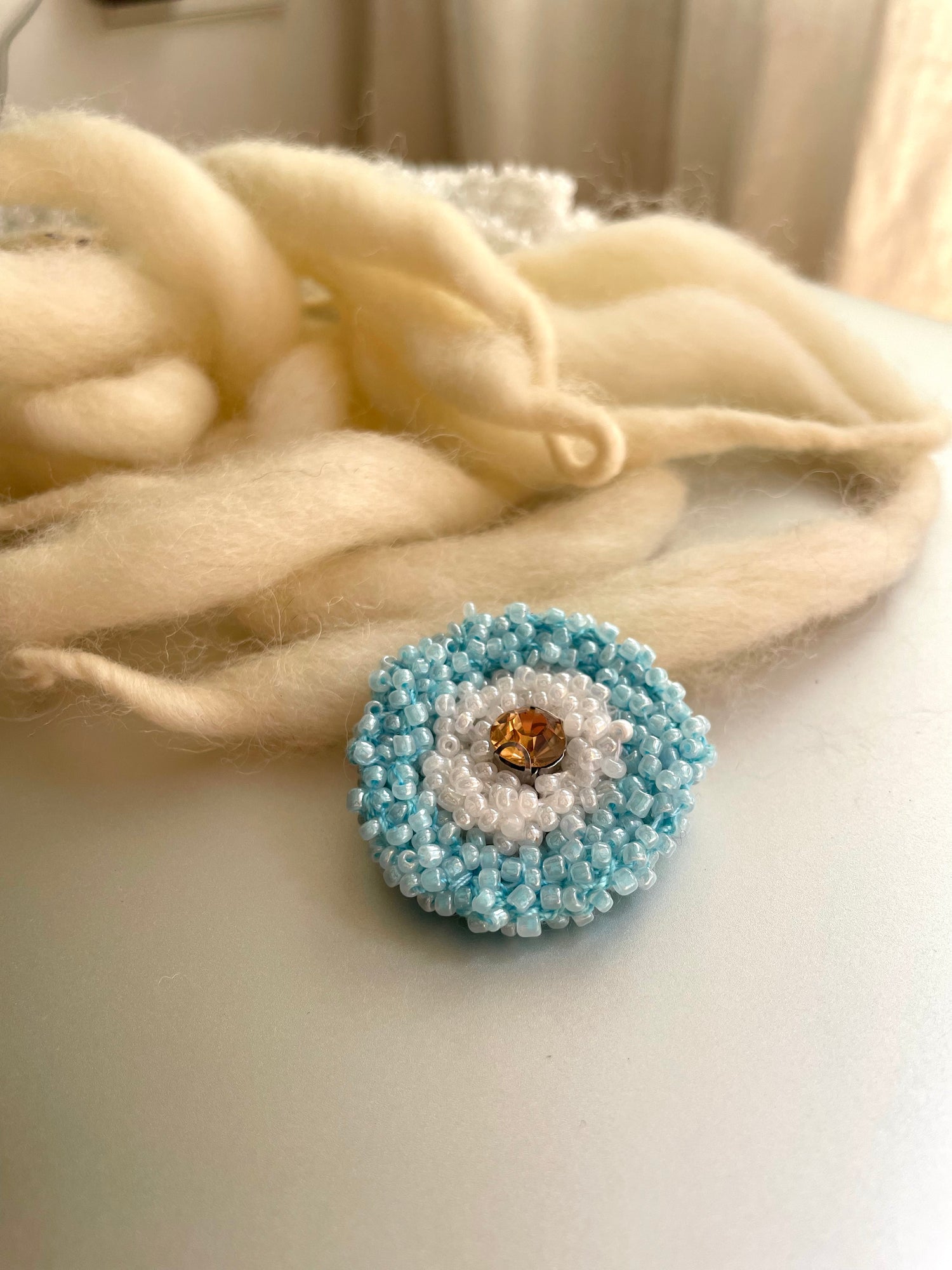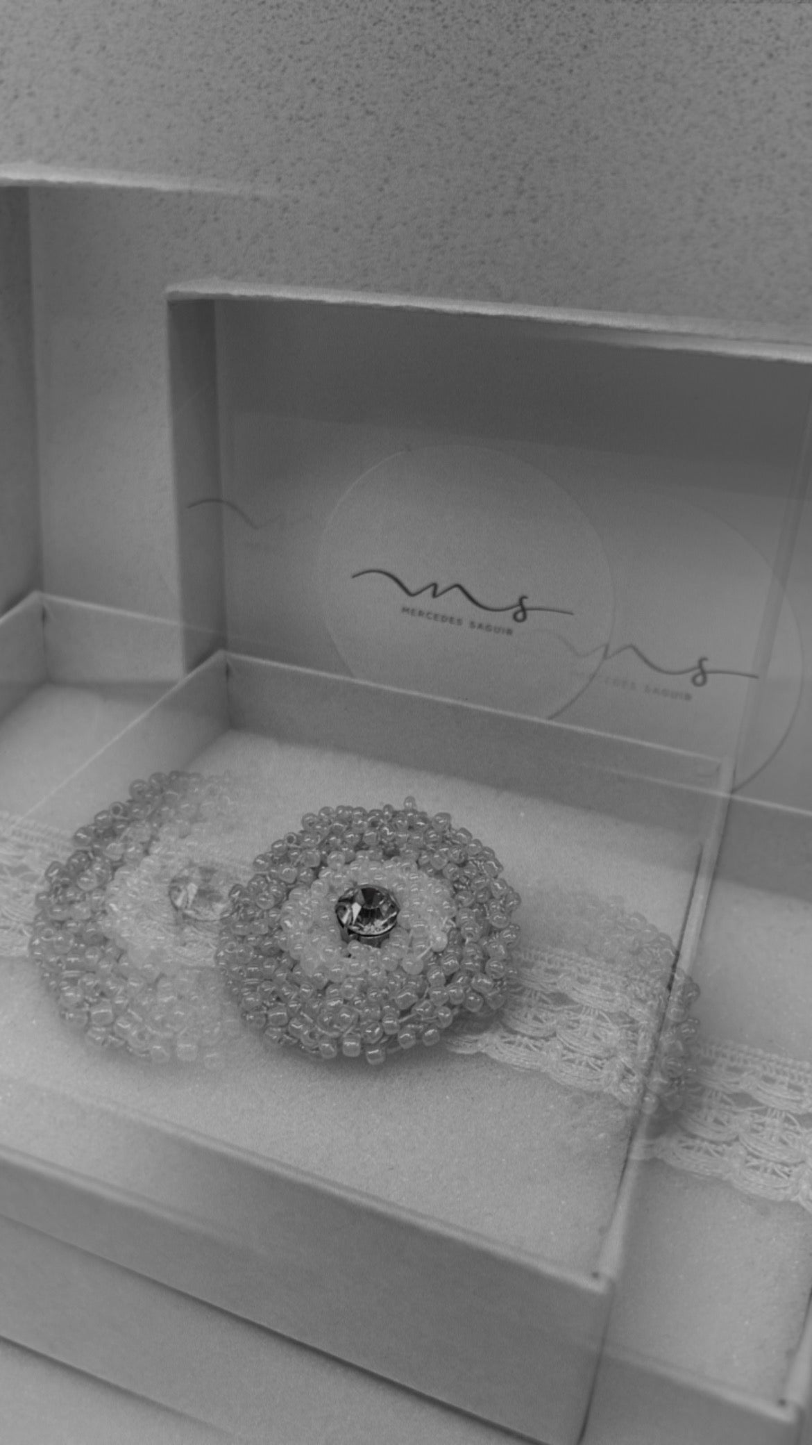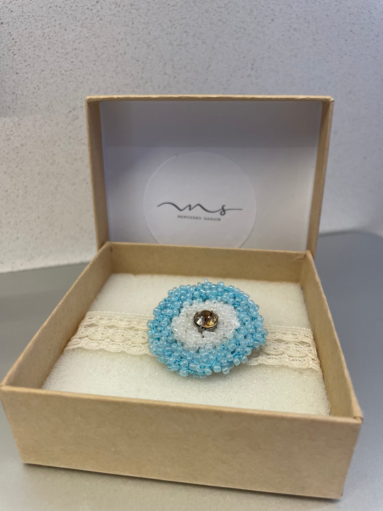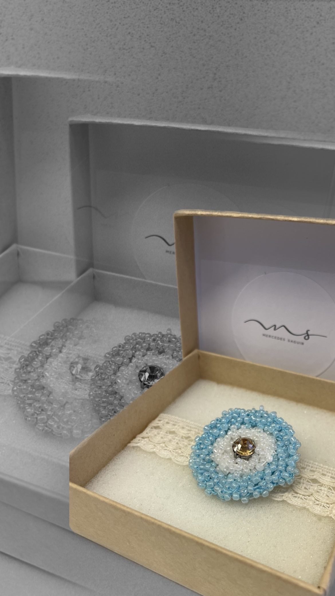 - Base rígida cosida con cordón de mostacillas en tonos blanco y celeste.