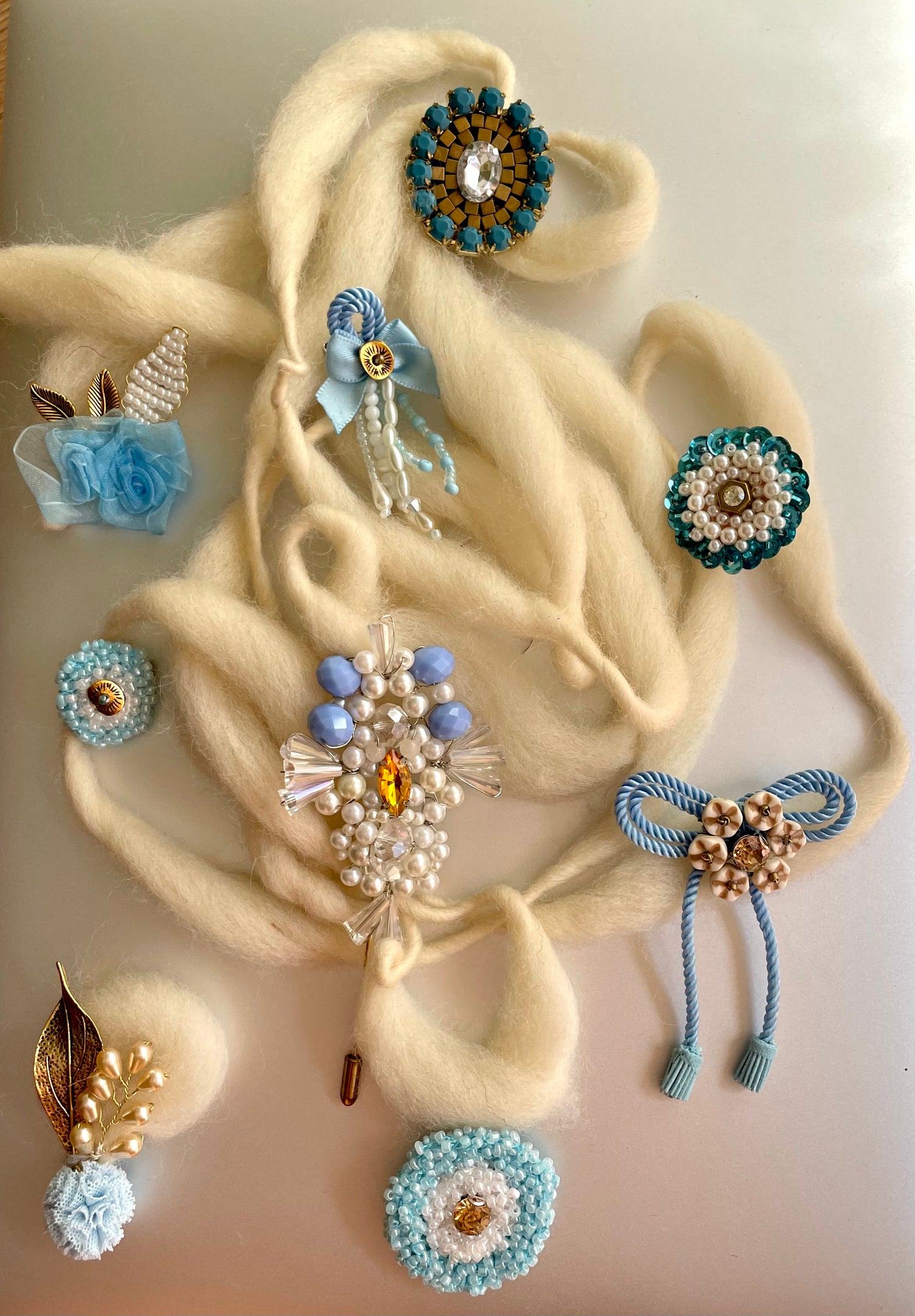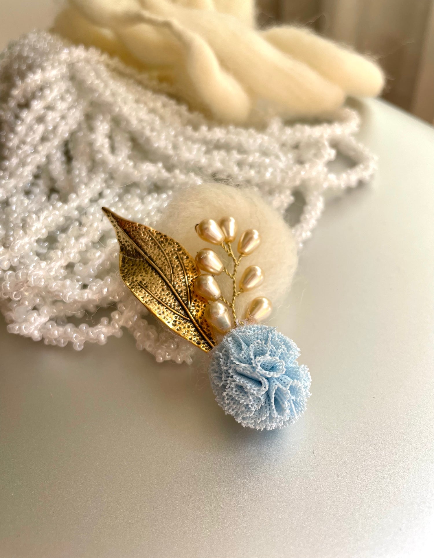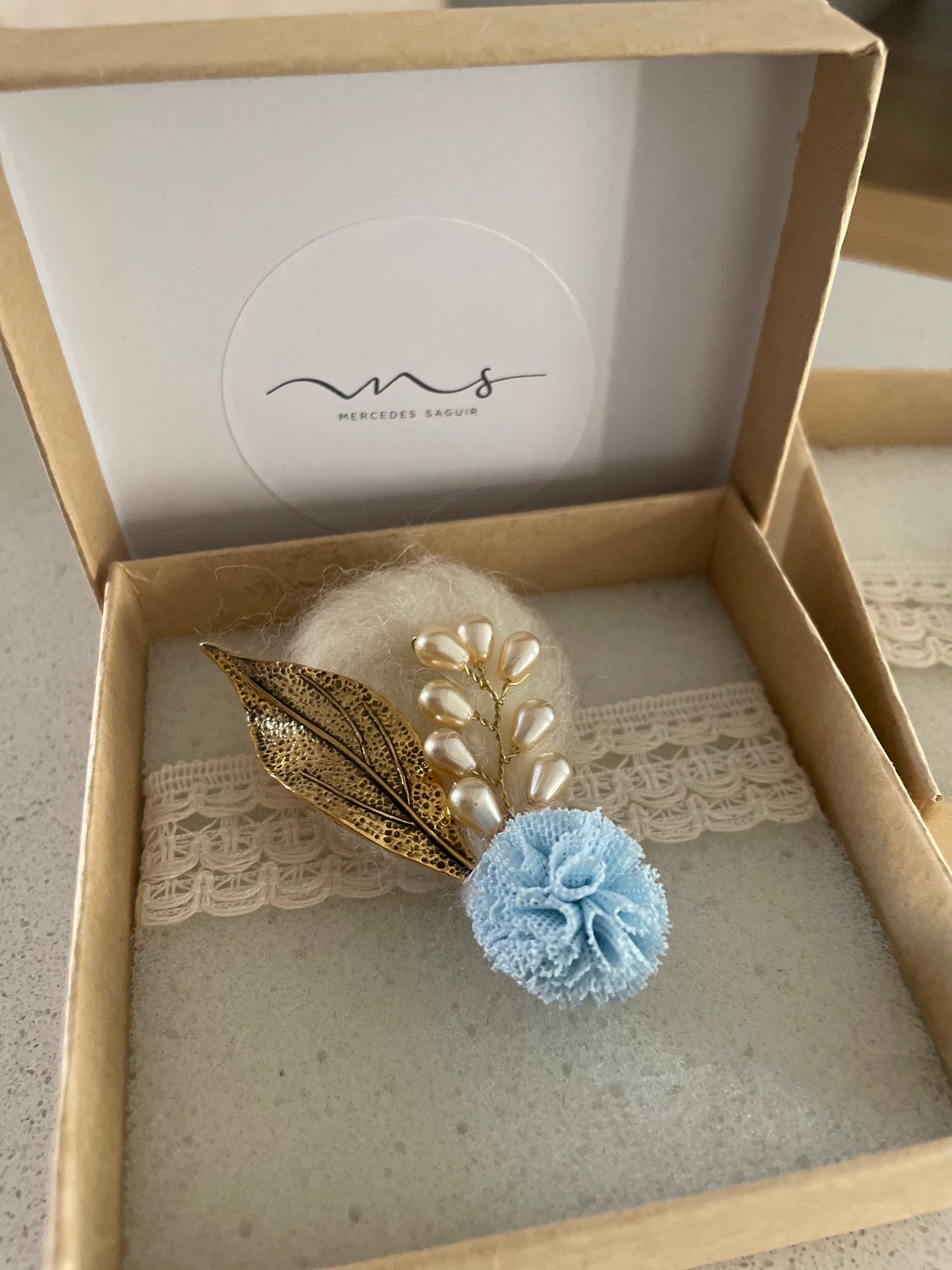 - Estos tres piezas se unen a un pompón de tela en tono celeste.