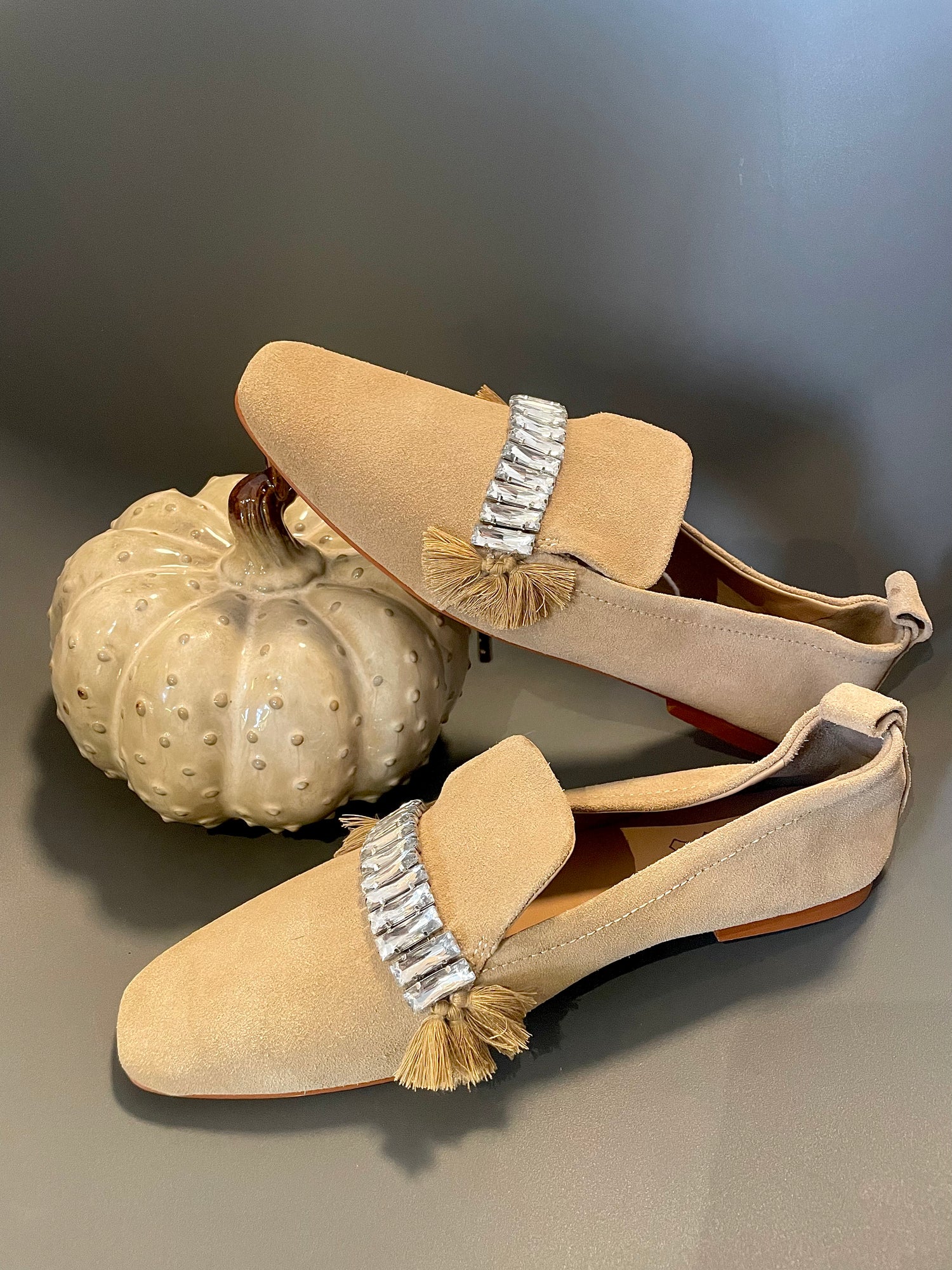 - Apliques con strass rectangular y flecos en tonos beige en ambos laterales ( los apliques están hechos a mano, pegados y cocidos a mano para dar mayor resistencia )