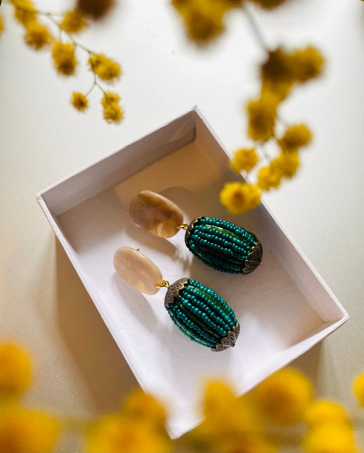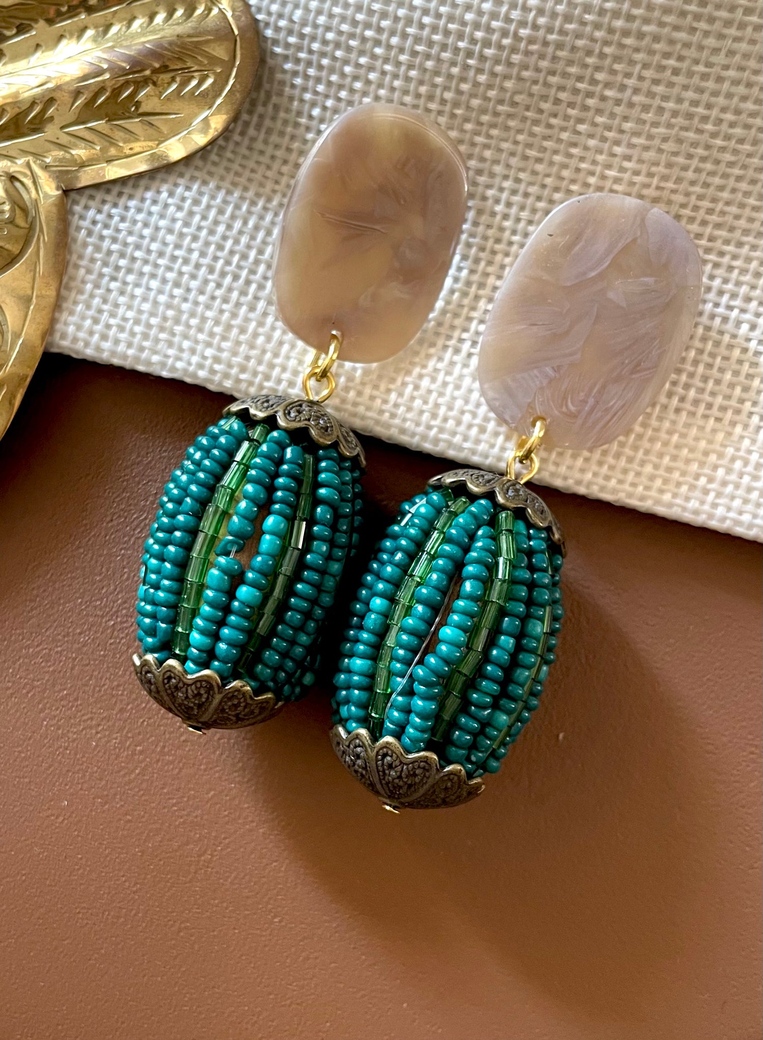 Pendiente de acrilico en forma oval y bolon recubierto con mostacillas mini en tonos verdes