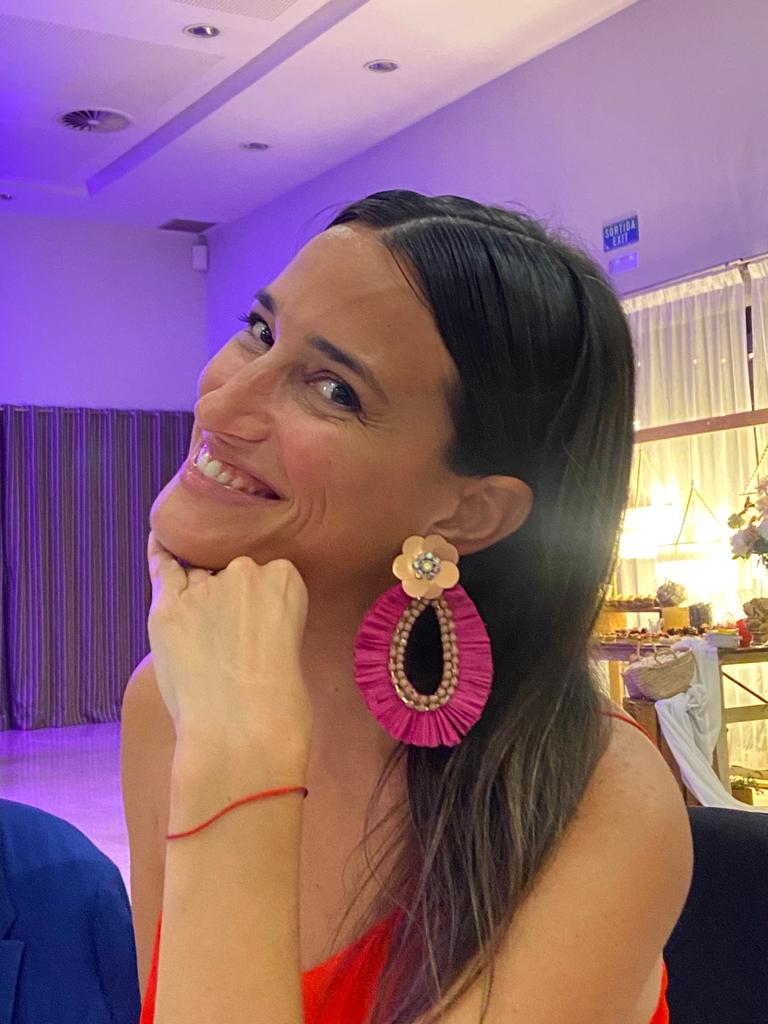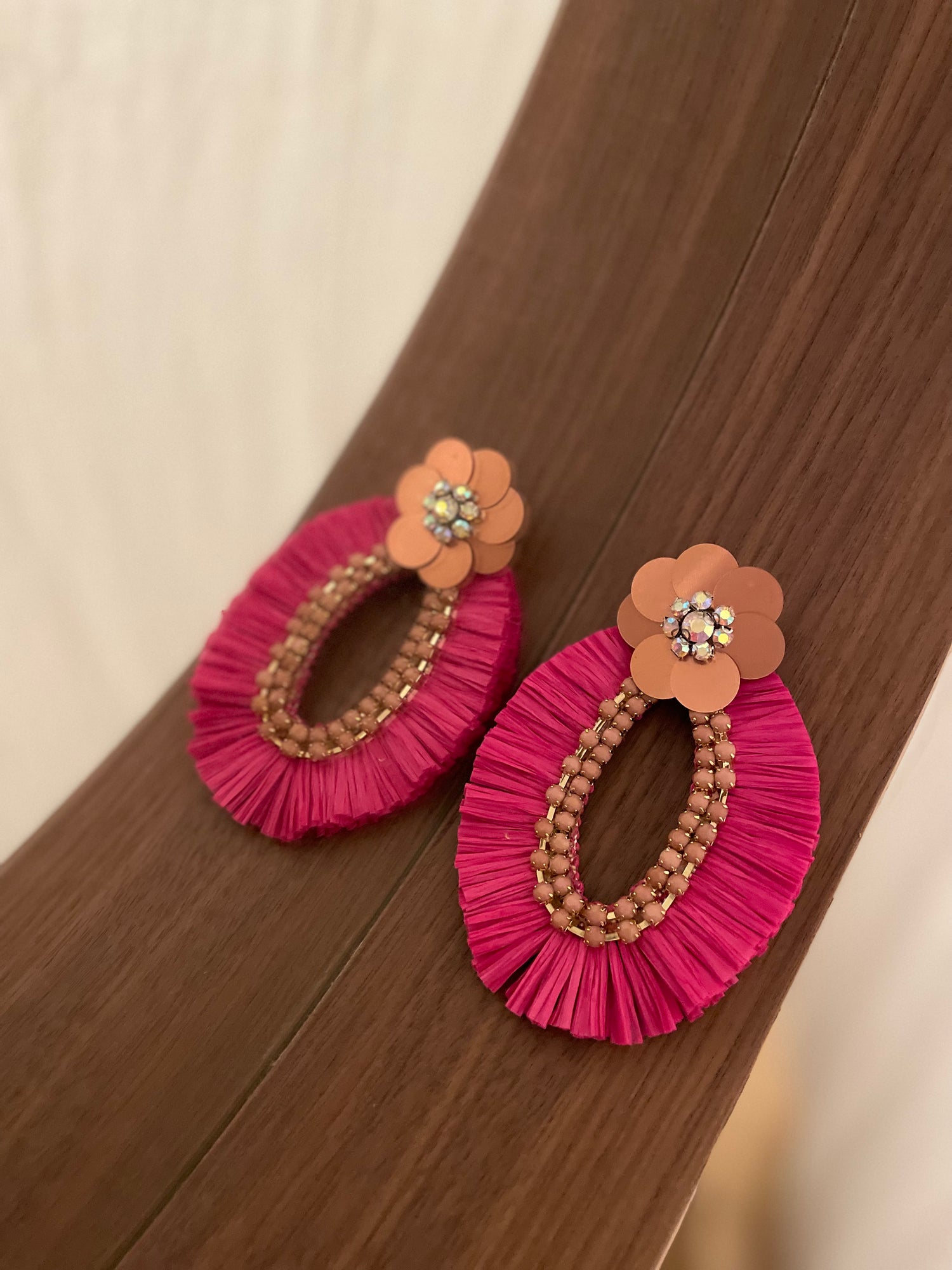 Pendientes Bambo, materiales rafia natural, strass y flor de lentejuelas largo.