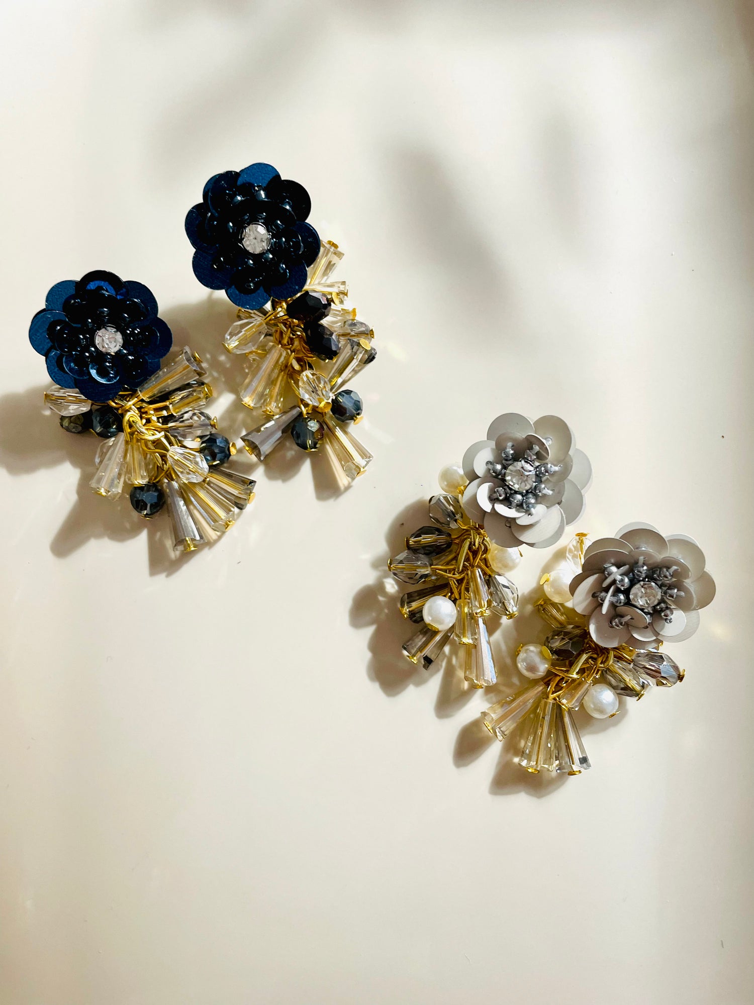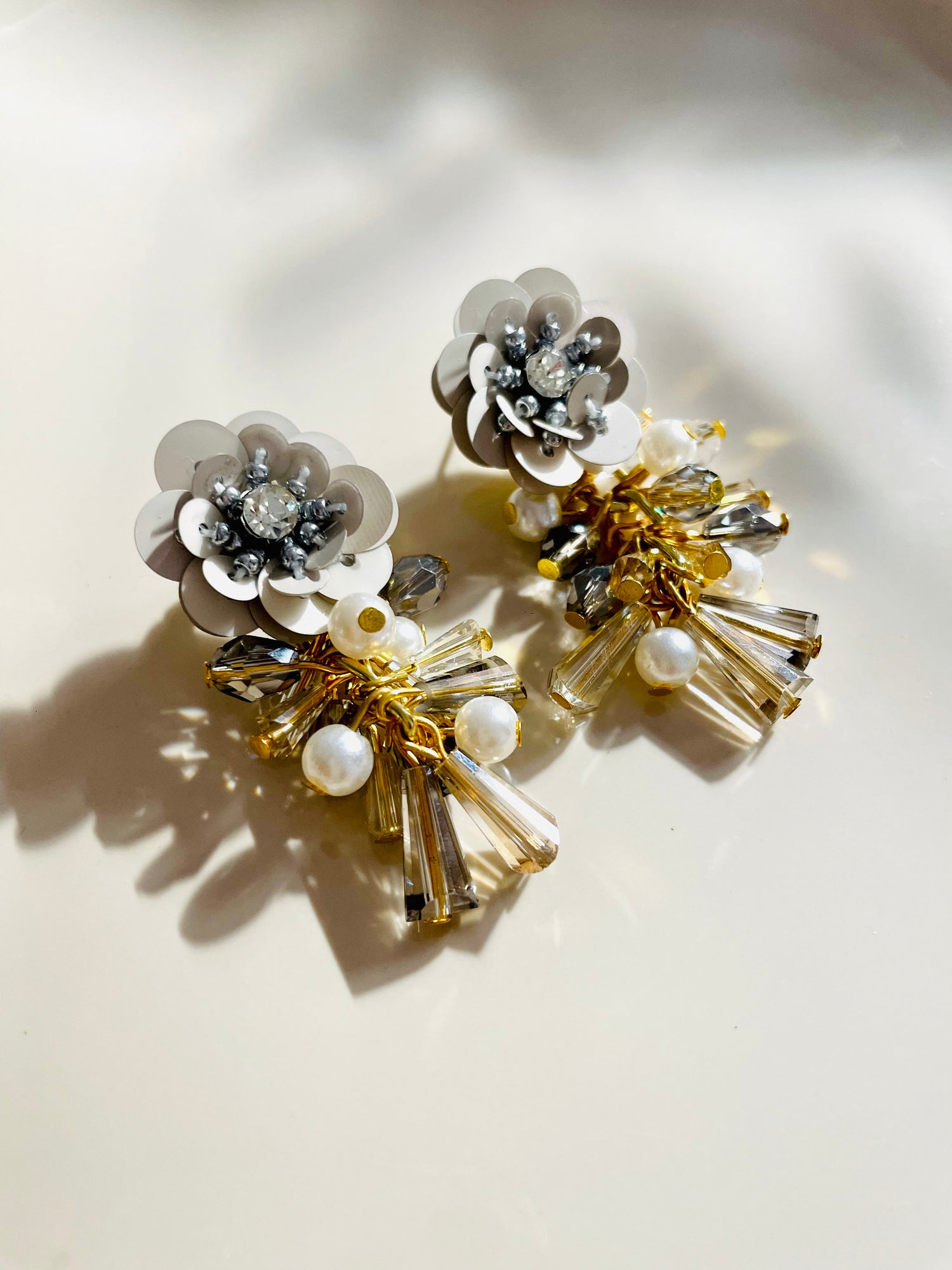 Nuestros pendientes Rose están diseñados con una flor central de lentejuelas y unas cascada de cristales y perlas en tono con la flor.