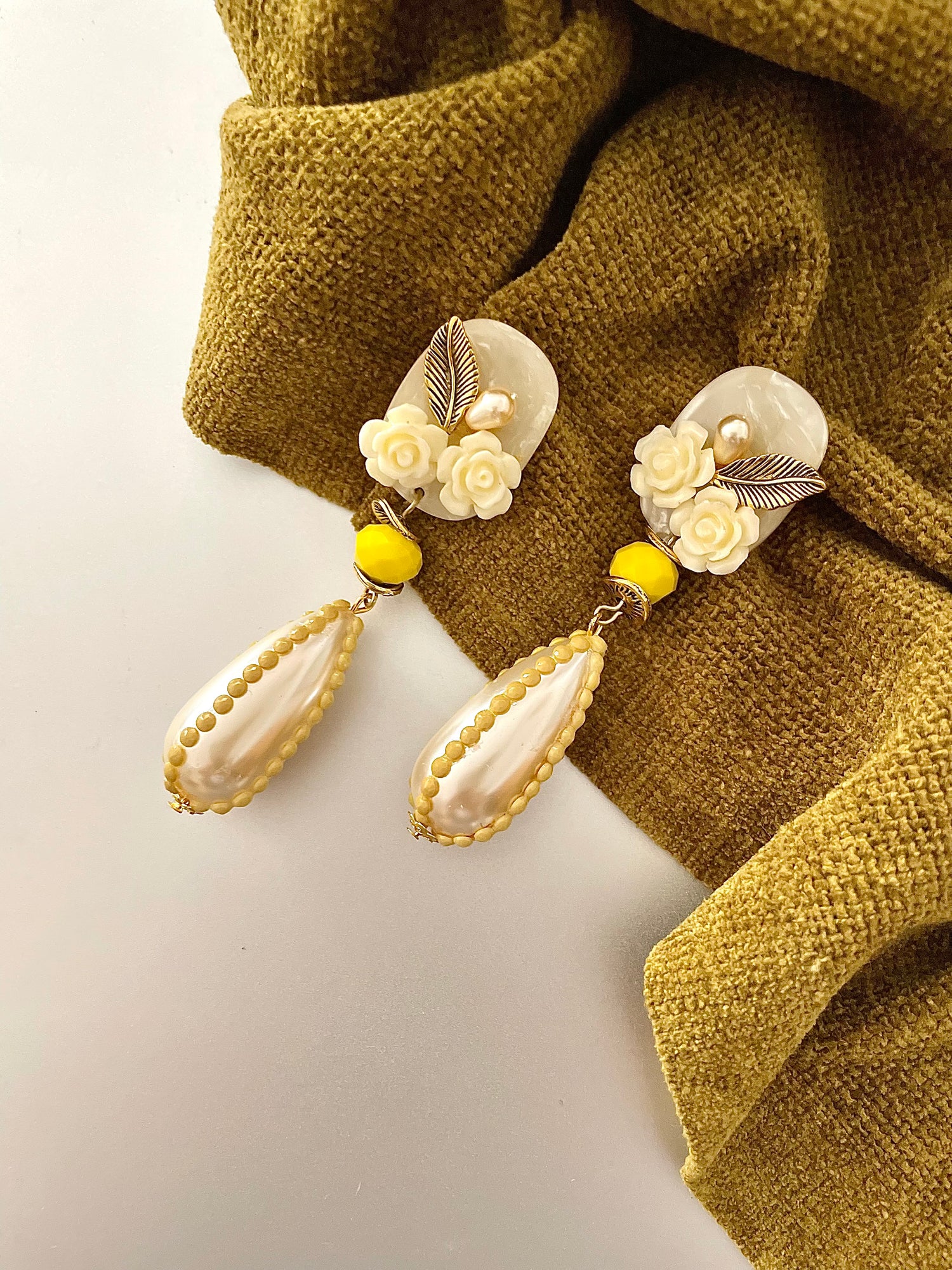 Pendientes armado con pasador de acrílico y una gota en forma de perla. La cual está diseñada y creada por la marca con mini piezas redondas pegadas una al lado de la otra formando 4 líneas en tonos engamados